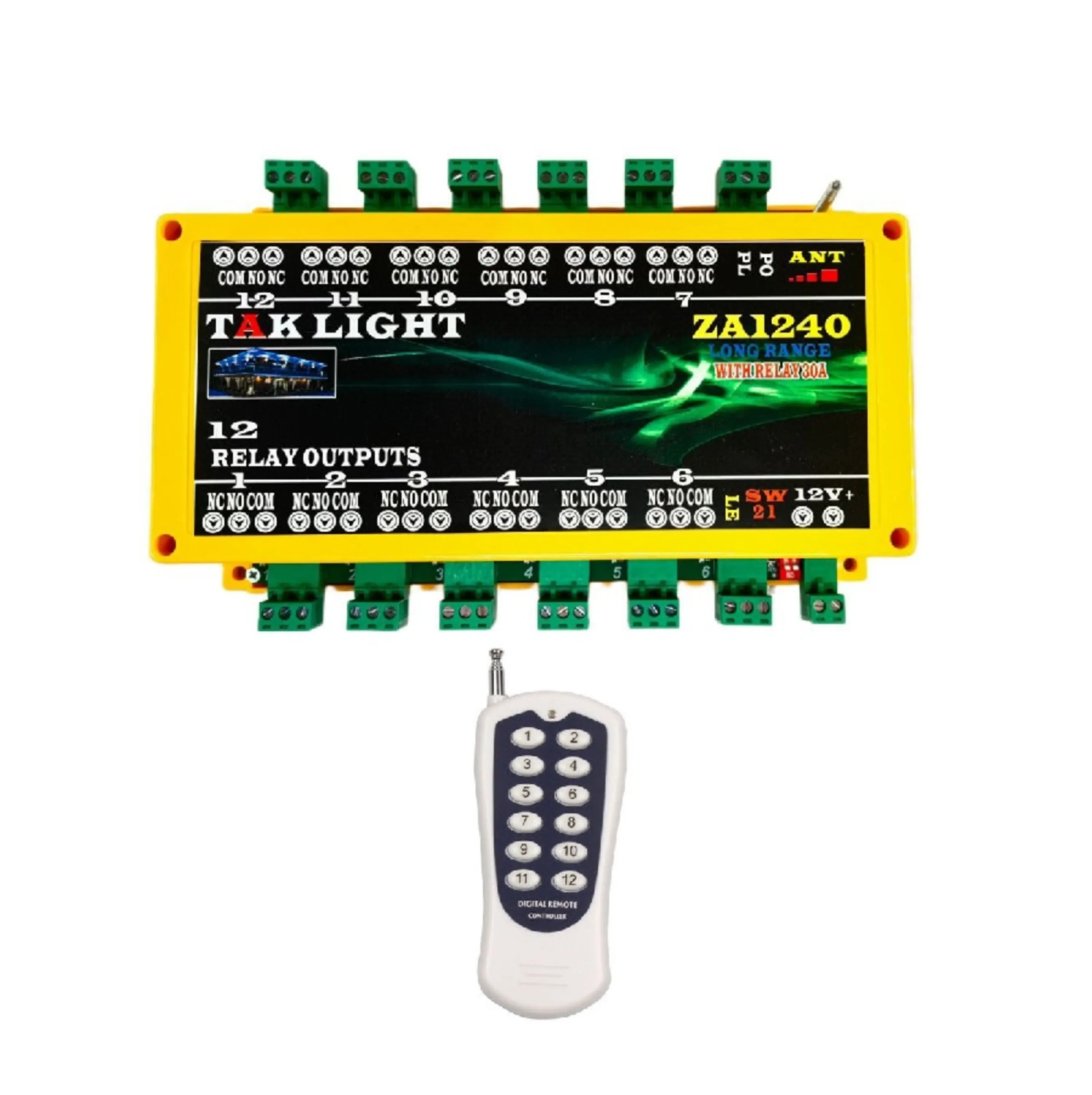 برای کنترل راه دور 12 سر خط روشنایی یا لوازم برقی پر مصرف کنترل راه دور ریموت دار مدل ZA1240 طراحی و ساخته شده است که در این گیرنده از رله های 30 آمپر استفاده شده است.این گیرنده برای کنترل تجهیزات روشنایی بسیار مناسب است زیرا به علت بار سلفی روشنایی LED و SMD یا لامپ های کم مصرف رله های جریان پایین آسیب پذیرند ولی این نوع رله با توان بالاتر مورد استفاده قرار گرفته است.