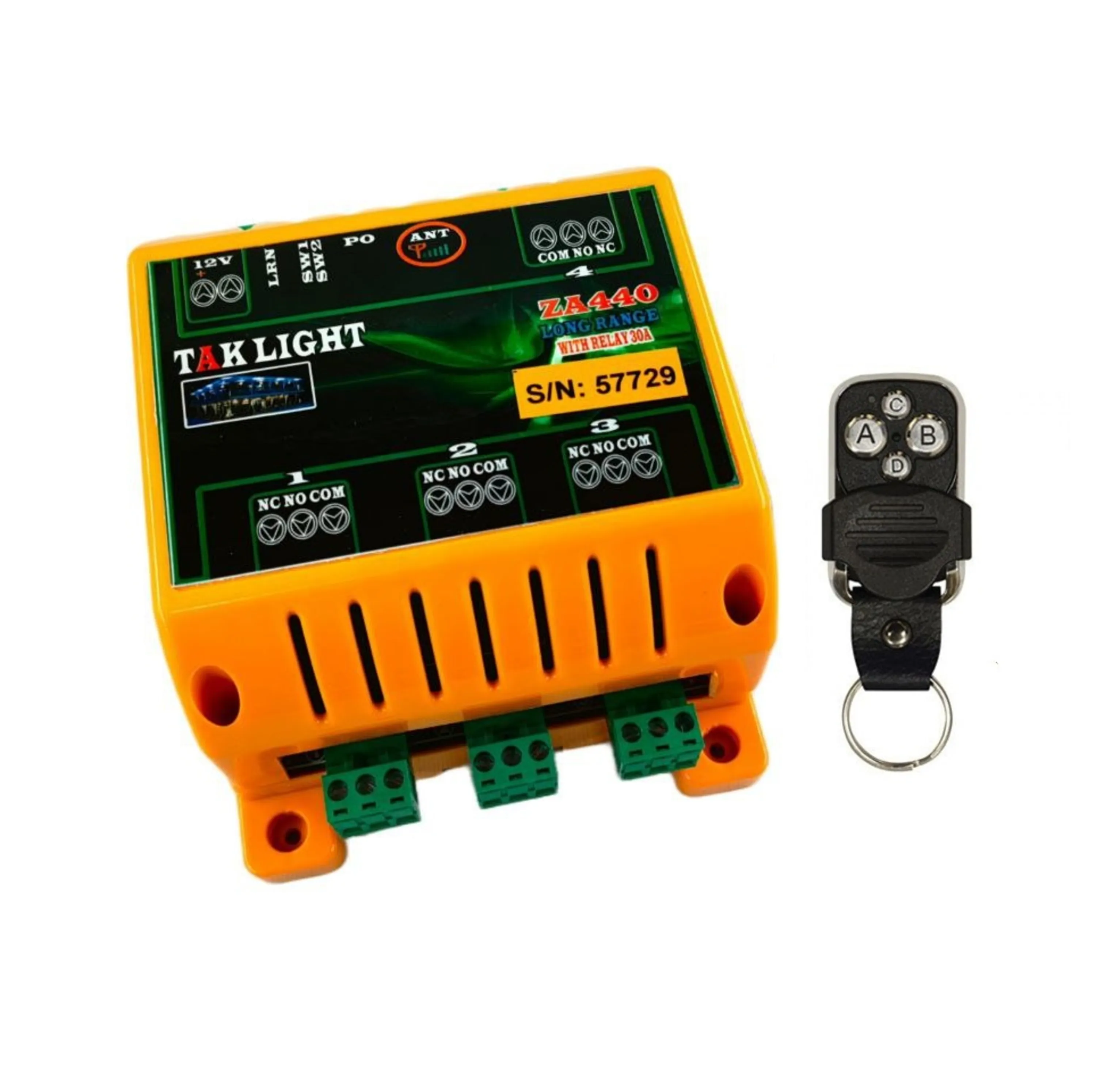 برای کنترل راه دور لوازم برقی پر مصرف کنترل راه دور ریموت دار مدل ZA440 طراحی و ساخته شده است که در این گیرنده از رله های 30 آمپر استفاده شده است.این گیرنده برای کنترل تجهیزات روشنایی هم مناسب است زیرا به علت بار سلفی روشنایی LED و SMD یا لامپ های کم مصرف رله های جریان پایین آسیب پذیرند ولی این نوع رله با توان بالاتر مورد استفاده قرار گرفته است.