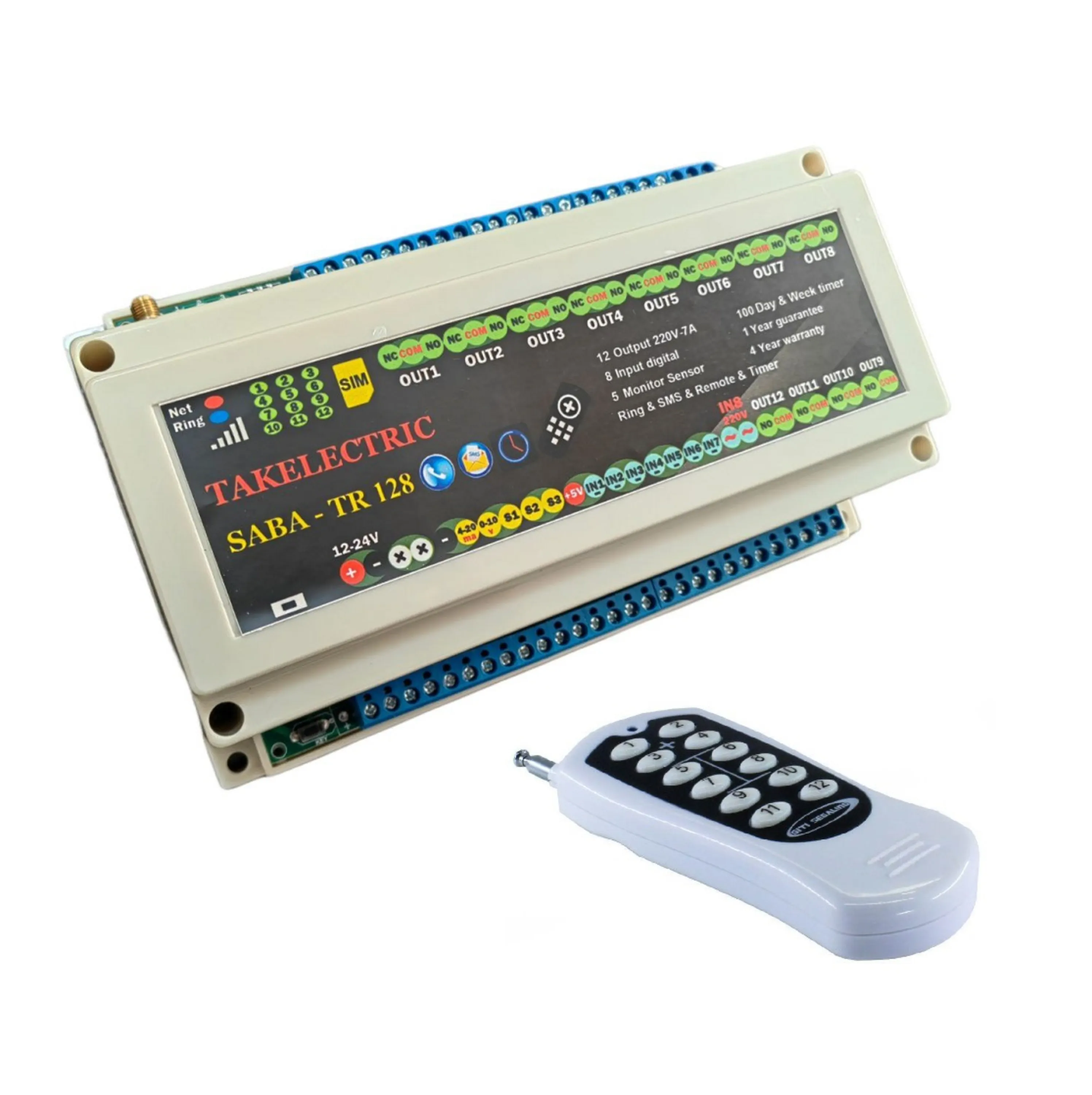 دستگاه کنترل پیامکی تایمردار و دارای ریموت رادیویی سری SABA مدل 128TR یک کنترل از راه دور 12 کاناله پیامکی پیشرفته است. خروجی های رله این دستگاه می تواند با توجه به تایمر های روزانه و هفتگی برنامه ریزی و روشن و خاموش شوند.