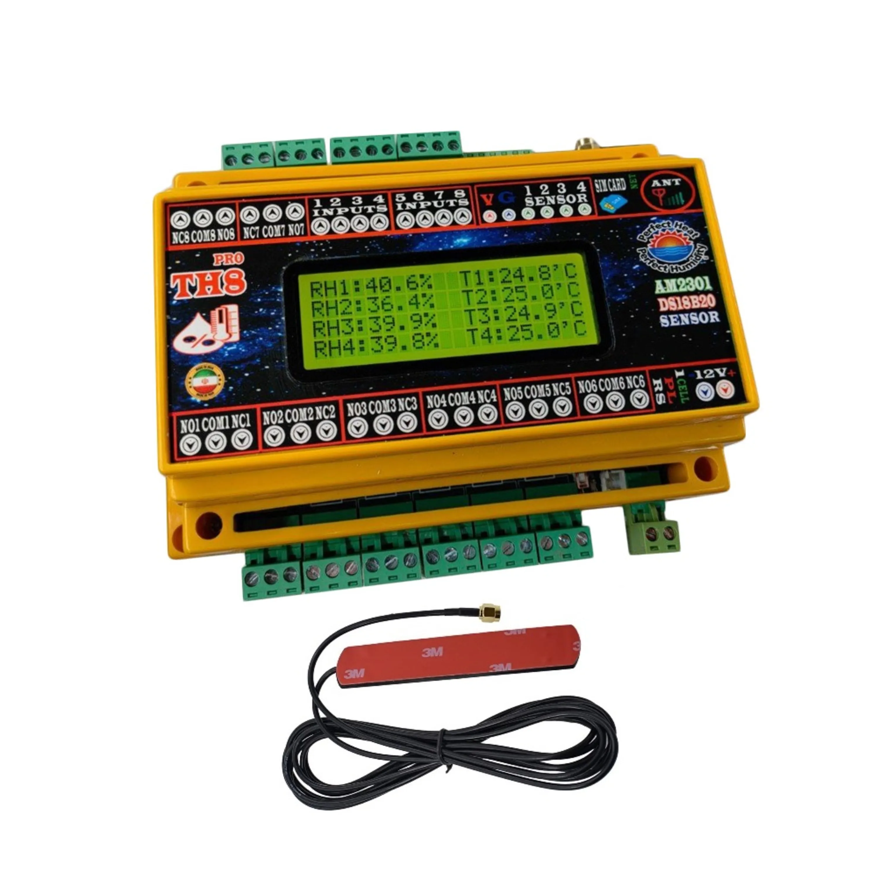 سیستم کنترل راه دور پیامکی حرفه ای با قابلیت نصب چهار سنسور دما و رطوبت و دارای 8 ورودی مجزا دیجیتال و 8 خروجی رله مستقل