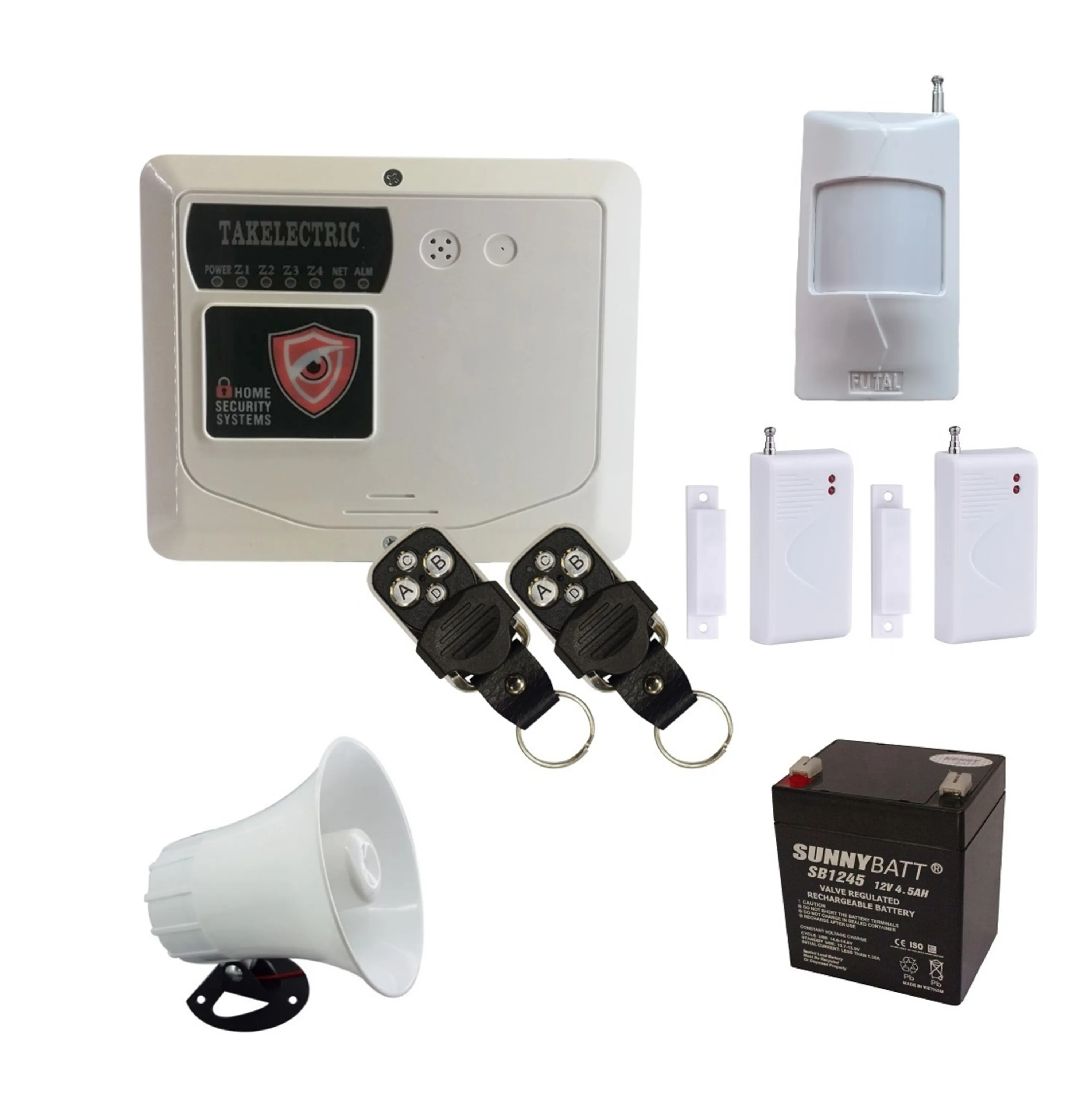 با دو مگنت بیسیم ، یک عدد چشم الکترونیک بیسیم و دو عدد ریموت رادیویی و یک عدد باطری 12 ولت 4.5 آمپر ساعت به همراه یک آژیر با سیم که تنها قطعه با سیم این پکیج می باشد.