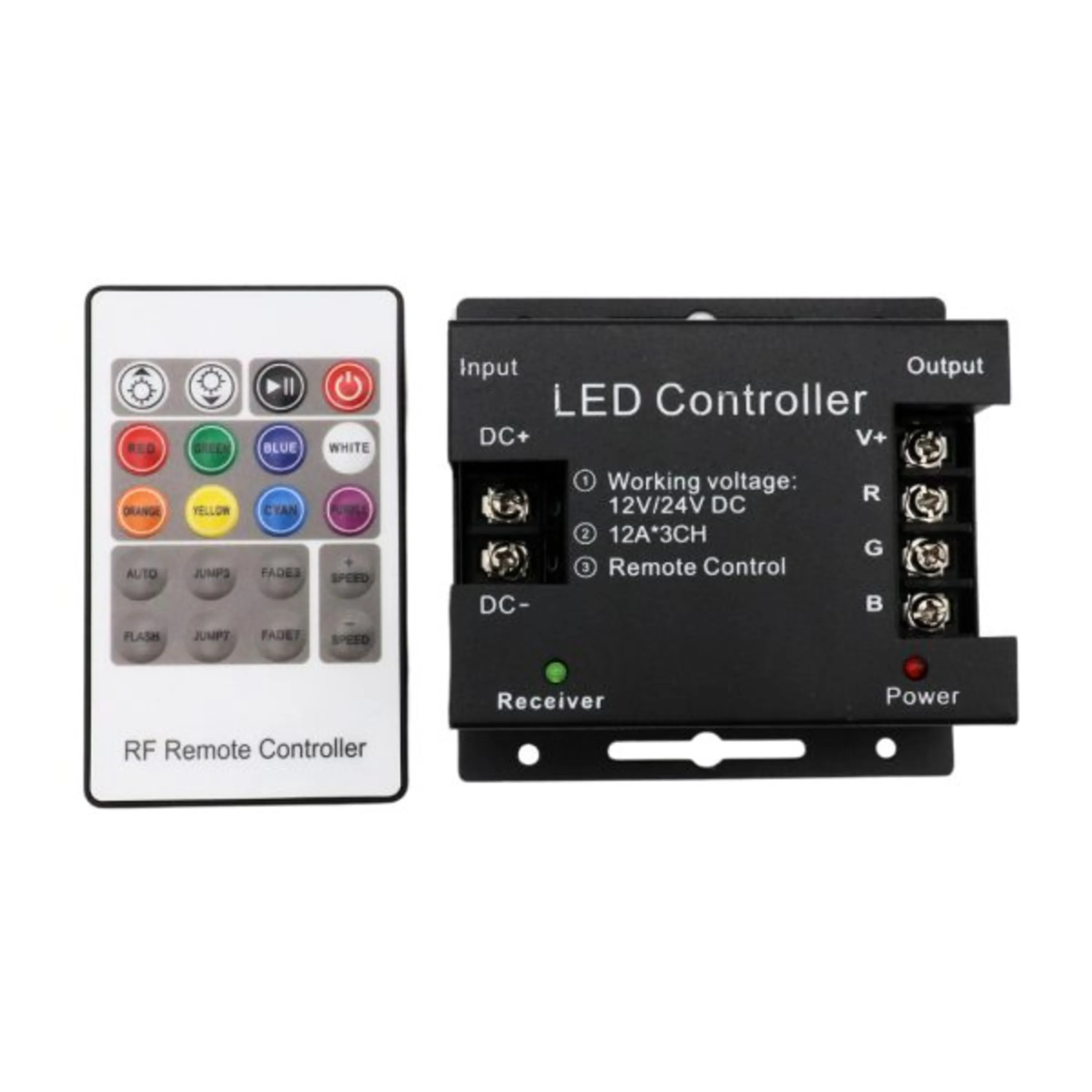 ریموت RGB با گیرنده سه کانال ورودی 12 تا 24 ولت DC که هر کانال 12 آمپر و مجموعا 36 آمپر می باشد مورد استفاده قرار می گیرد.