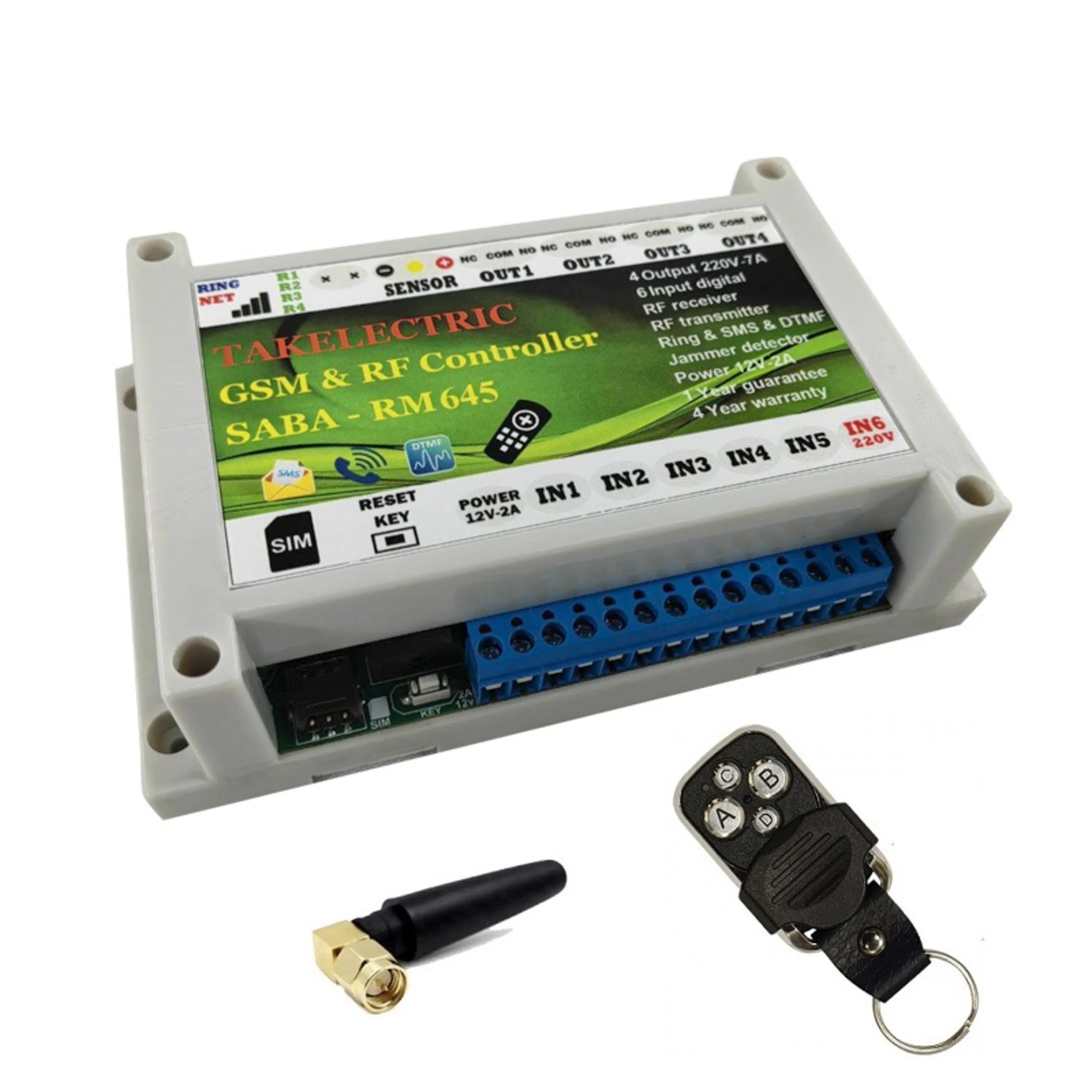 کنترلر پیامکی RM645 یک کنترل از راه دور پیامکی با زبان فارسی و انگلیسی است که با ارسال پیامک یا زنگ زدن به آن یا با ریموت کنترل رادیویی می توان دستگاه را کنترل نمود . همچنین این دستگاه دارای 6 ورودی دیجیتال است که با تحریک هر یک از آنها ، هشداری روی تلفن همراه کاربران ارسال می گردد . کارکرد آسان، کاربرد متنوع و تنظیمات ساده از مزیت های این کنترل پیامکی با قابلیت افزودن ریموت رادیویی می باشد. همچنین نظارت ایمن بر دستگاه ها و تجهیزات متصل به سیستم با ارسال پیام اجرای دستور به کاربران با امکان کنترل راه دور با برد نامحدود در حالت پیامک فراهم شده است